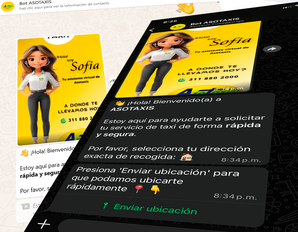 • CTAs visibles a WhatsApp y a la App Asotaxis Fusa en Google Play para pedir taxi y hacer seguimiento.